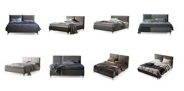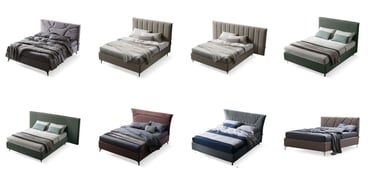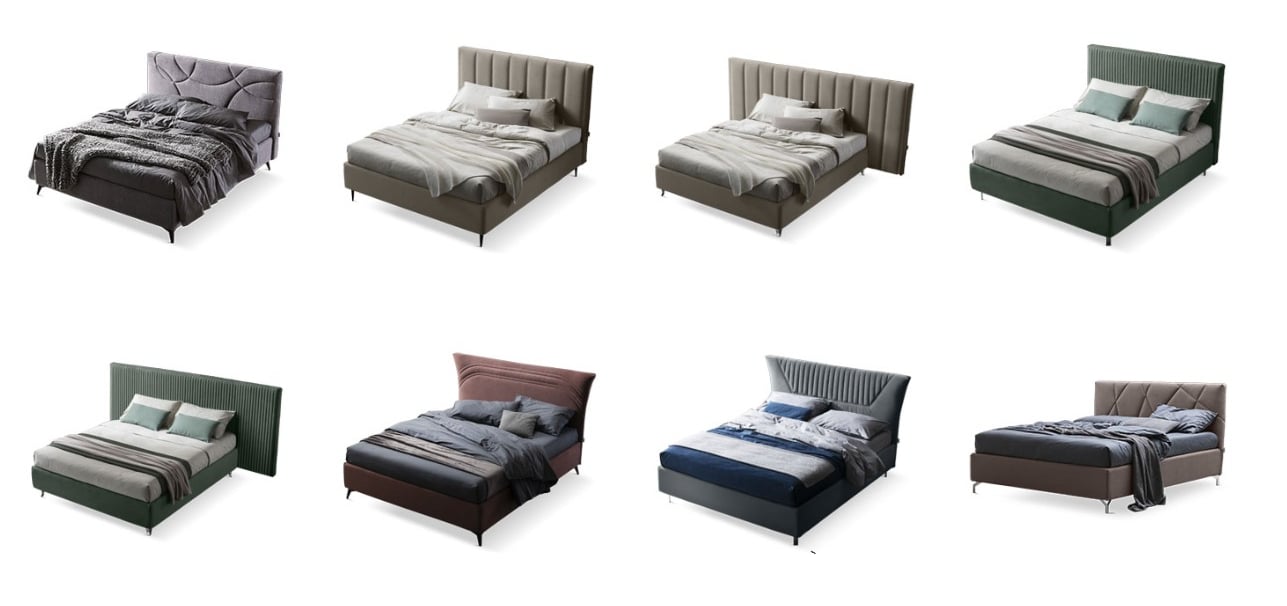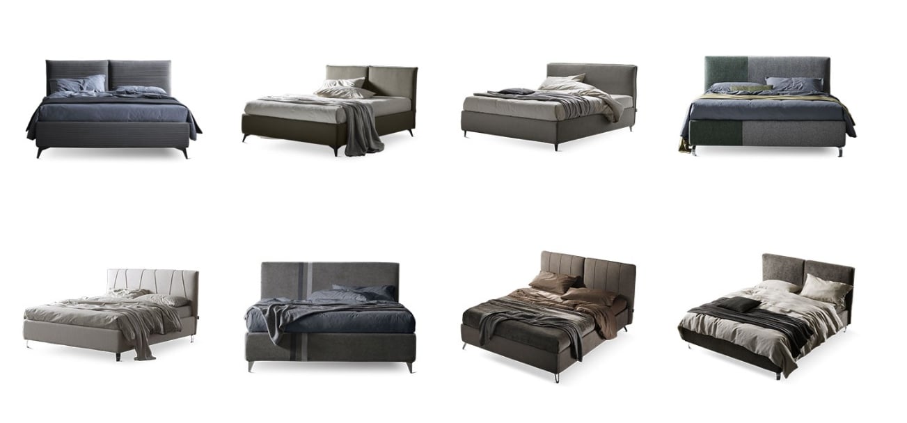 Letti personalizzabili con contenitore o senza contenitore, piedini e tessuto a scelta da catalogo.